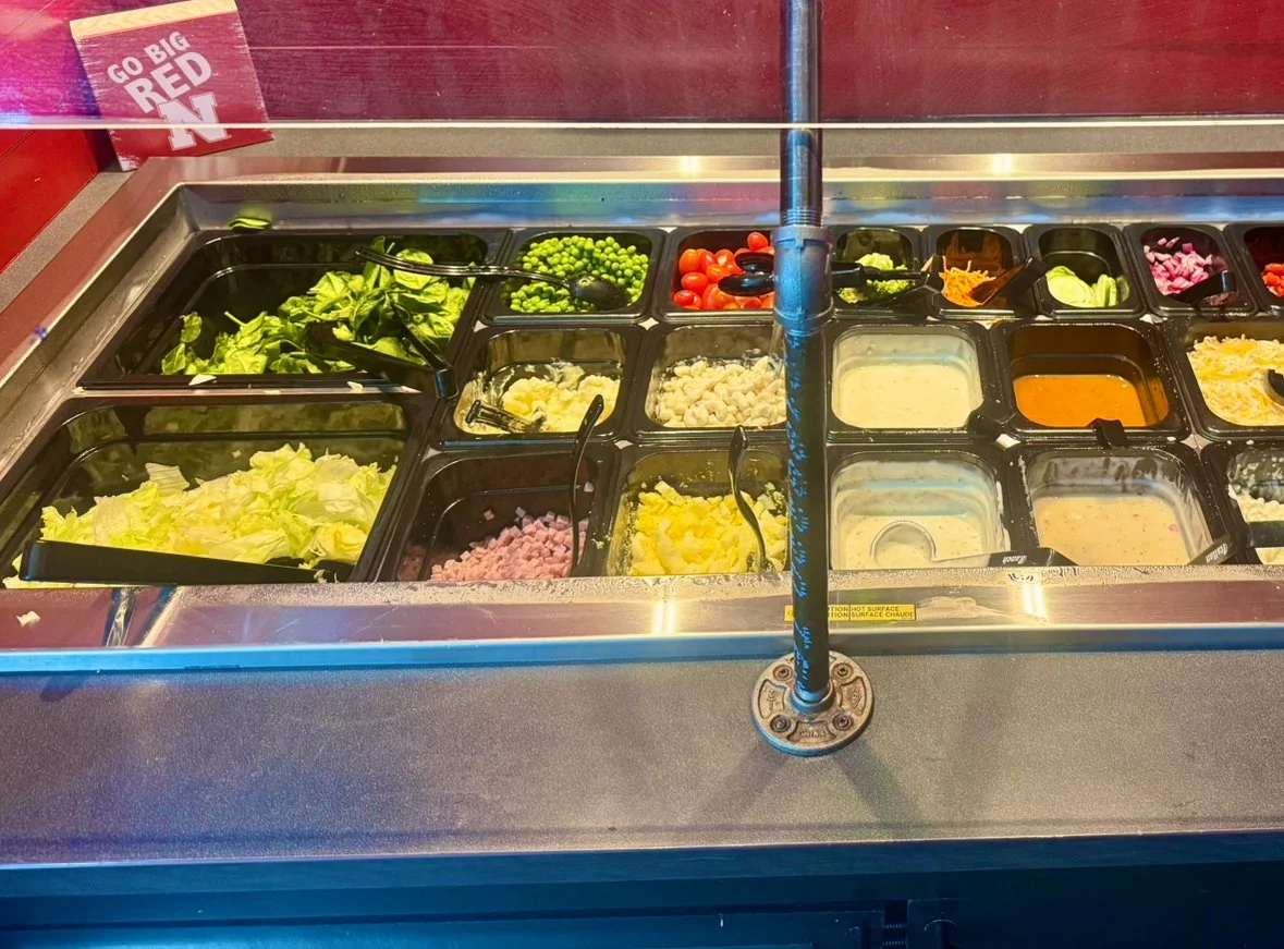 While waiting, I made myself (and my baby) a plate from the salad bar— The lettuce was crisp, everything was well stocked and clean, and none of the veggies were wilted or soggy. My little one loved the cold macaroni salad and sweet peas. I loved the variety of choices in toppings and dressings.